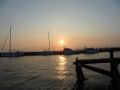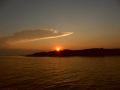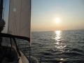 Während der Ausfahrt einen Sonnenaufgang wie er im Bilderbuch steht. Kurz nachher setze ich Segel denn der Wind könnte doch genug stark sein. Und ja bis 6 kt kann ich segeln. Ich trimme die Genua mit allen Mitteln. Verlängere den Holepunkt nach hinten, spiele mit dem Traveller des Gross bis jeweils die beste Einstellung gefunden ist.