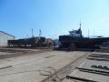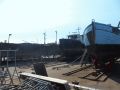 ein Schlepper (oder sagt man Stosser ?) wird mit seinem Lastschiff ins Trockendock geslippt. Das Lastschiff zuerst das hat ca 60t. Dann den Schlepper ca 50t. Der fährt auf den Slipwagen im Wasser und wird dann mit einer Winde über die Schräge auf Schienen auf dem Rollbock an Land gezogen. Oben auf der Ebene gehts dann auf eine in 90° gewinkelte Rollanlage mit vielen Stumpfgeleisen. Die Seitwärtsbewegung wird mit einem Hubstapler bewerkstelligt. In das Stumpfgeleise wird dann wieder per Seilwinde gezogen. Dann wird von Hand mit 2 Hydraulikpressen das Schiff etwas angehoben und unterstellt. Dann wird der Rollbock wieder weggezogen.