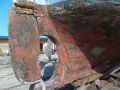 Die Ruderanlage ist auch sehenswert. Es wird so viel belassen wie es geht. Selbst die Schleifspuren der Netztaue an den Seitenwänden werden nicht eliminiert. Er muss es so machen dass es in Ordnung ist innen und aussen. Und dann mit dem Eigner zusammen macht er den Innenausbau.