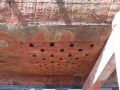 Im vorderen Teil des Schiffes hat es an der Unterseite auf einer Länge von ca 150 cm Löcher. Er erklärt mir dass im Schiff ein Bassin ist für die Fische die man daraus frisch verkauft hat. Und Aale seien automatisch da reingekommen und man hätte sie nur mit der Hand nehmen können. Auch hätte es immer frische Muscheln drin gehabt, wie in einer Zucht .