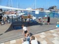 Auf dem Stupfgeleise nebenan wird ein Holzboot restauriert. Der Schreiner bohrt 60mm Löcher vorne und hinten an der Unterseite und lässt (sehr) viel Wasser ab. Der 2. erklärt mir alles. Das sei Regenwassser, das Schiff selbst ist dicht. Es ist 1948 gebaut und seit 10 Jahren nicht mehr aus dem Wasser gekommen. Aber immer dicht gewesen. Es sind einige Planken vor allem der Wasserlinie entlang und oberhalb die sie nun wechseln müssen. Darunter wird nur mit dem 3-Eckschaber gesäubert ggf neu genagelt und dann gestrichen.