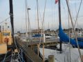Ich mache 2-3 Schleifen in Buchten, entdecke jedoch keine freie Box die mir Breit genug erscheint. Da sehe ich an einem Kopfsteg eine Arbeitsbarke. Da ja Sonntag ist werden die wohl nicht arbeiten denke ich und ich lege direkt dahinter an. Die Länge passt genau. Der Platz ist ideal für mich weil ich am nächsten morgen nur ca 50 m zur Hafenausfahrt brauche. Das Anlegen super easy, auch wenn es recht Wind hat der mich vom Steg Länsseits wegdrückt. Ich habe eine Leine am Bug vorbereitet und am Heck. Die Enden habe ich im Cockpit. Sobald ich kann wechsle ich auf den Steg belege provisorisch die Bugleine (der Wind kommt schräg von vorne), dann die Heckleine. Habe dann alle 4 Fender an die Stegseite platziert und dann die Leinen richtig angepasst sowie eine Spring am Bug gemacht damit sichergestellt ist dass ich mit dem Buch das Heck des Arbeitsschiffs berühren kann.