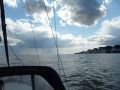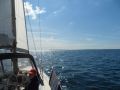 Wind ziemlich achterlich. Es geht zu Beginn recht gut. Wir müssen aber den Kurs ändern so dass der Wind echt von achtern kommt. Also Schmetterling mit Bullentallie. Und zeitweise habe ich die Genua mit dem Enterhaken rausgehalten.