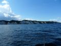 Nach den Klippen von Klintholm dann (immer noch kein Wind) aber es kommen Wolken. Man sieh schön wie sie ausleeren (schön kann man schon sagen wenn man weiter weg ist). Glücklicherweise können wir die letzte dieser "Schütter" umfahren indem wir näher unter Land fahren.