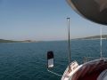 Dann gehts raus durch die betonnte Ausfahrt. Draussen dreht dann der zuerst zuhinterst fahrende Katamaran auf und ist schnell verschwunden. Wir sind etwas schneller als die Fähre mit den Autos.