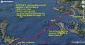 Aha ein Schleppnetz. Ich muss die Fahrt etwas verringern und falle zudem noch ab. Er geht dann ca 300m vor mir durch. Doch ich weiss nicht was der unten hat, so bleibe ich noch bis 1sm weg von seinem Wasser.
