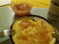Zum Frühstück gibts Zopf mit Quitte, Pfannkuchen mit Wurst und/oder Quitte, mit Käse, Oliven und das obligate Ei.