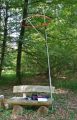 Den Mast an einem Holzbänkli befestigt, die oberen Segmente des 10m Teleskop Masts ausgezogen und die Antenne montiert.